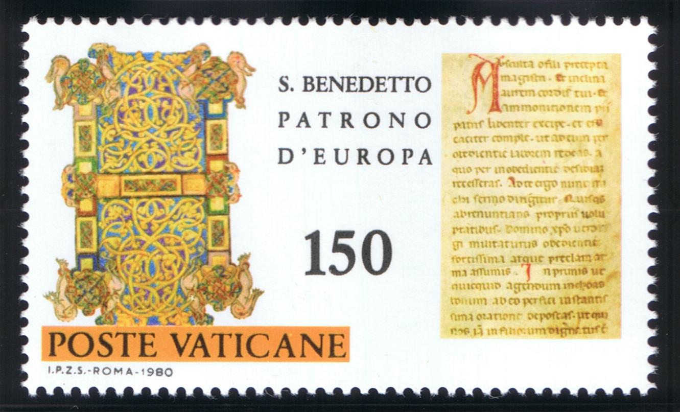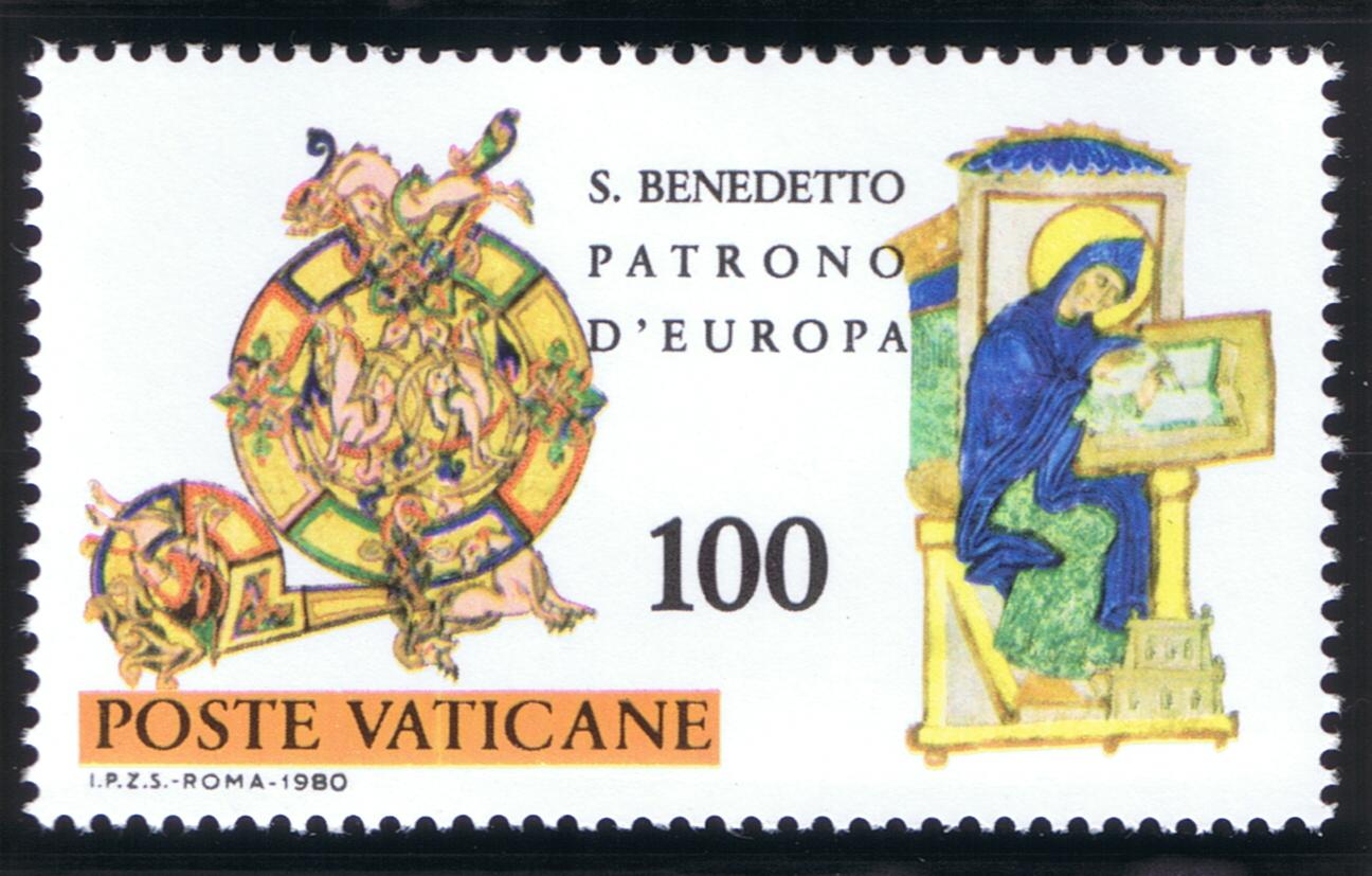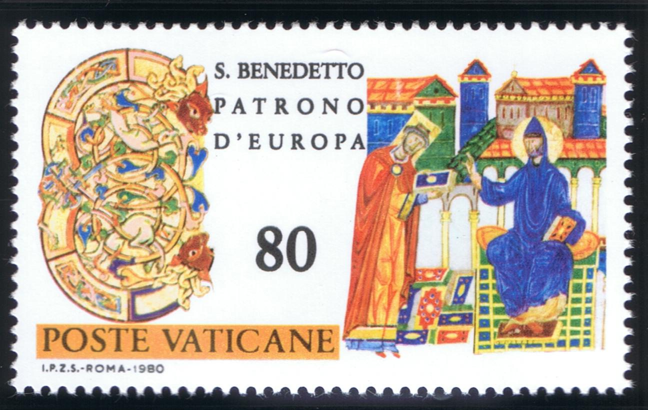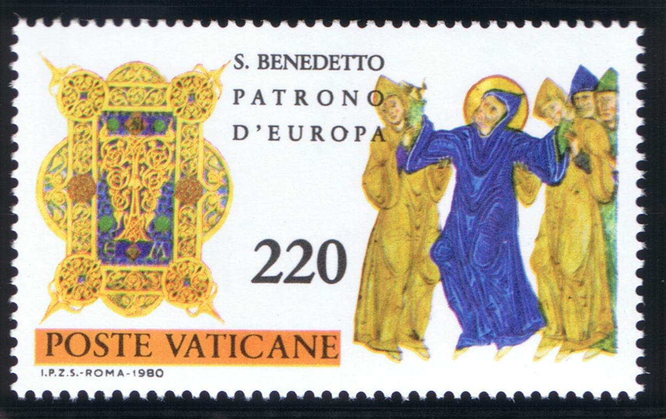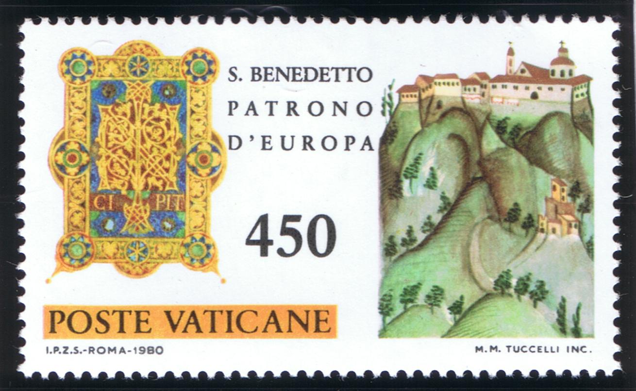 St. Benedict (ca. 480-547/550) composed his monastic Rule after 529 when he relocated to Monte Cassino to establish the famous monastery, located 80 miles (130 km) southeast from Rome, on a high plateau overlooking a broad plain. Benedictine Monasticism spread throughout Europe and is one of the especially important factors influencing the development of ‘Europe.’ St. Benedict is considered the ‘Patriarch of Western Monasticism.’ He was named Patron of Europe by St. Paul VI in 1964 and, along with Ss. Cyril and Methodius, were named Co-Patrons of Europe by St. John Paul II in 1980 on the 1,500th anniversary of Benedict’s birth. For a person so important in Church History, little specific is known about St. Benedict and his dates are somewhat uncertain. The main somewhat contemporary source is the Dialogues of St. Gregory, the Great. He was born in Nursia, studied for a time in Rome, and at approximately age 14 he became a hermit at Subiaco in Lazio, near Tivoli, overlooking the River Aniene or Teverone (ca. 494). The Sacred Grotto (Sacro Speco) is a part of St. Benedict’s Abbey and the nearby Abbey of St. Scholastica, Benedict’s sister. He was invited to organize groups of hermits into a monastic foundation at Subiaco, occasionally meeting with resistance, including attempts on his life. In ca. 529 Benedict relocated to Monte Cassino where over time an abbey was built on a former Roman pagan site. The monks that gathered there were guided by The Rule of St. Benedict, a series of 73 chapters or precepts which directed monastic life, a path which was followed in other future European monasteries, and which eventually spread world-wide. The Rule sets down organizational principles, patterns of monastic life, roles and functions within a monastic community. In writing his Rule, St. Benedict states ‘…we intend to establish a school for the Lord’s service. In drawing on its regulations, we hope to set down nothing harsh, nothing burdensome.’ He admonishes monks that they ‘prefer nothing whatever to Christ, and may He bring us together in everlasting life.’ A principle of Benedictine hospitality is that ‘all guests…are to be welcomed as Christ.’ The principles of the Rule are adaptable to time and circumstance, even to our own day, adopted by laypeople as Benedictine Oblates, who follow the rule in daily, secular life. Monte Cassino, like many monasteries, experienced periods of vicissitude during its long existence. Allied planes bombed the abbey during World War II because German troops occupied the area and, after the bombing, occupied the ruins of the monastery. A bitterly fought assault by Free Polish brigades finally won the day for the allied forces. The abbey’s treasures and documents were evacuated to Rome before its destruction. Monte Cassino was restored after the war and rededicated by Paul VI. Portions of its buildings and grounds are open to visitors by schedule. St. Benedict’s reputed tomb is located behind the high altar of the Abbey, said also to contain the relics of his sister, St. Scholastica, the founder of an order of sisters who follow the Rule of St. Benedict. Another tradition holds that these relics (or some of them) were transferred to France (in ca. 673) during years that Monte Cassino had been abandoned following a 580 Lombard sack of the monastery. St. Benedict and/or St. Scholastica have been depicted not only on Vatican City stamps but by San Marino, Italy, Austria, and Italy. The Benedictine abbey at Subiaco was severely damaged by an earthquake on 30 October 2016. During a 2008 Wednesday audience, Pope Benedict XVI stated that Benedict contributed ‘a fundamental influence on the development of European civilization and culture. …[Benedict’s life and Rule]…were to prove heralds of an authentic spiritual leaven, which in the course of centuries, far beyond the boundaries of his country and time, changed the face of Europe following the fall of the political unity created by the Roman Empire, inspiring a new spiritual and cultural unity, that of the Christian faith shared by the peoples of the Continent. This is how the reality we call ‘Europe” came into being.’