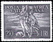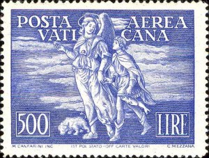 The belief in Guardian Angels began in antiquity and is continued in Judaism and Christianity into the modern era as well. For example, in Exodus 23:20 God told Moses, “Behold, I send an angel before you, to guard you on the way and to bring you to the place which I have prepared [the Promised Land of the Covenant].” In the Book of Tobit, Tobias is guided by the disguised Archangel Raphael on a journey to Media to collect money owed his father, during which he also marries the beautiful Sarah, and both return to Nineveh, where Tobias’ father is cured of blindness. Raphael reveals his identity in Chapter 12 which ends, “So they confessed the great and wonderful works of God and acknowledged that the angel of the Lord had appeared to them (Tb.12:22).” Chapter 13 is a long hymn of praise and thanksgiving to God. In Matthew, Jesus also refers to the guardian angels: “See that you do not despise one of these little ones; for I tell you that in heaven their angels always behold the face of my Father who is in heaven. (MT 18:10).” In Acts of the Apostles, St. Peter is freed from prison by an angel: “Now I am sure that the Lord has sent his angel and rescued me from the hand of Herod and from all that the Jewish people were expecting (Acts 12:11).” The Feast of St. Michael and All Angels is commemorated on 29 September (Michaelmas). The Feast of Guardian Angels was promoted in Austria, Spain, and Portugal in the 16th century and became universal by Pope Clement X in 1607. While no specific Vatican City stamp commemorates the Memorial of the Guardian Angels, angels are included on many issues, especially air mail stamps, featuring St Gabriel, patron saint of messengers, postal workers, radio broadcasters, telecommunication workers, and stamp collectors. References: • Dawn Marie Beutner, Saints • David Farmer, Oxford Dictionary of Saints Article Link: • Greg Pirozzi, “1948 Raphael and Tobias Issue: Scarce Imperforate Errors” : Vatican Notes, Vol. 67, No. 381, p. 54 (2019) • Morris Raskin, “The Story Behind The Stamp” : Vatican Notes, Vol. 34, No. 3 p. 10-11 (1985) | ||||||||||