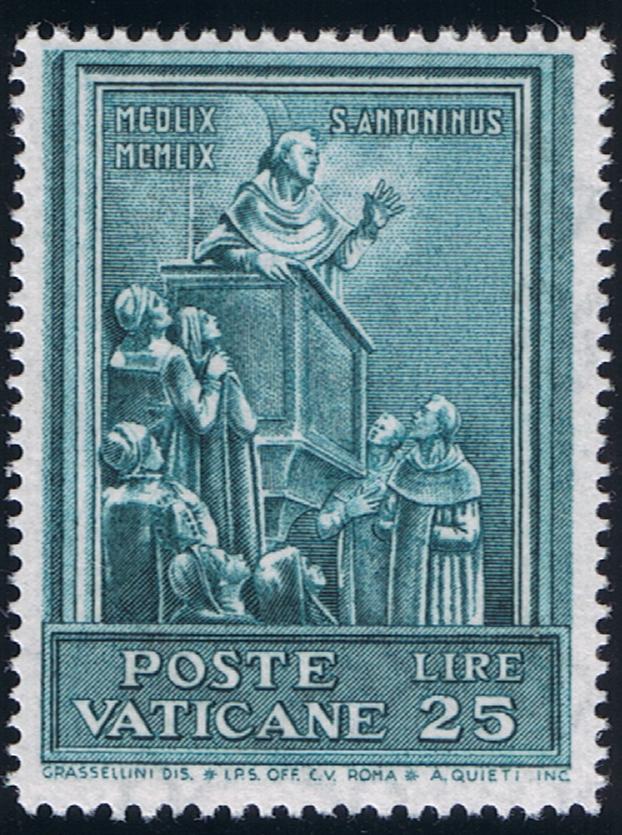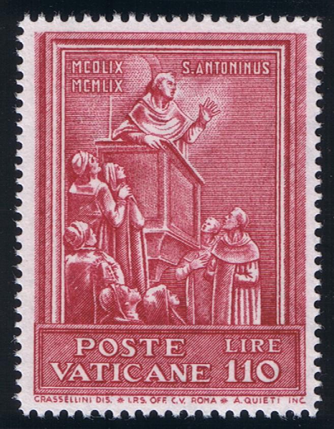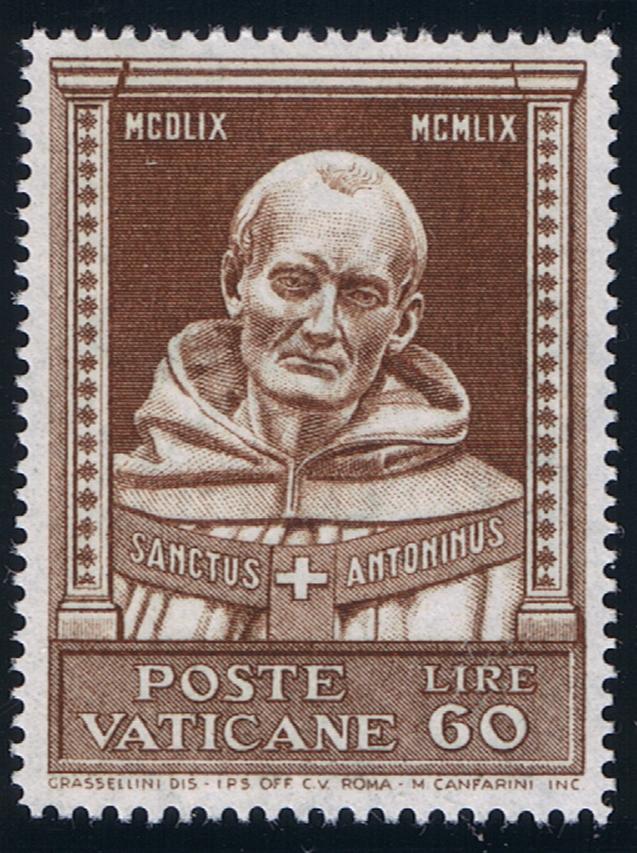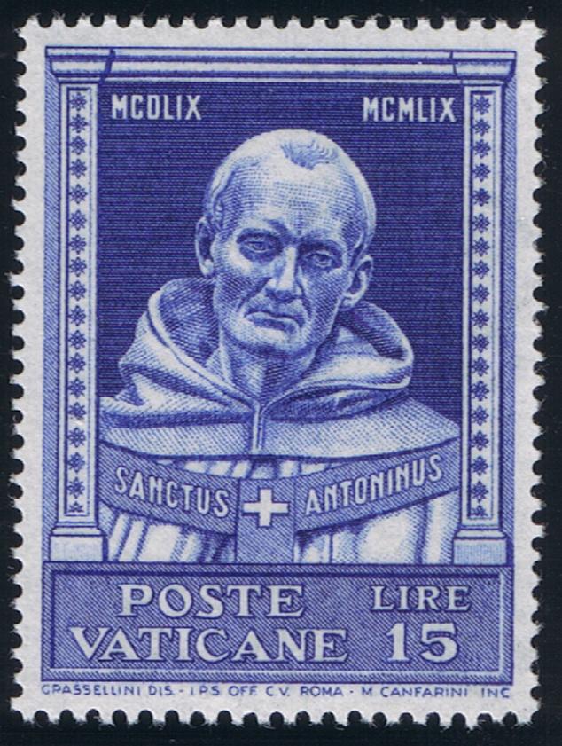 Antonio Pierozzi, 1389-1459) is an archbishop of Florence. Much of his life occurred during the Great Schism of the West when Rome and Avignon vied for control of the Church (1378-1417), the Conciliar Movement during the first half of the 15th century, and the fall of Constantinople in 1453. St. Antonino was a monastic reformer as well as a theologian and other works. A Dominican (1405), he undertook administrative reforms of the order in his diocese as well as in Italy. Antonio established St. Mark’s Convent in Florence, later decorated by Fra Angelico’s frescoes. St. Antonio lived a life of poverty even as archbishop and is known for his personal frugality and generosity to the poor, especially during the plague of 1448 ad the earthquake of 1453. He traveled throughout his diocese by foot or by mule, visiting all parishes. At his death a few pieces of furniture were his only possessions. From 1439-1445 he served as papal theoogian and attended the Council of Basel-Ferrara-Florence, (1431-1449). Pope Pius II presided over Antonio’s funeral in 1459. He was canonized in 1523. References: • Farmer, Oxford Dictionary of Saints Article Links: • James C Hamilton,“St Antonino: A First Day Cover Survey”: Vatican Notes, Vol. 62, No. 360 pp. 4-5 (2012) | ||||||||