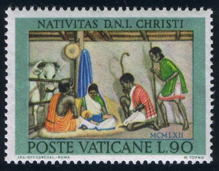 ![]() Christmas 1961 (Scott 323-325) 1962. For this year’s issue, depictions of the Nativity are taken from a scene set in India, following a design by Marcus Toano: