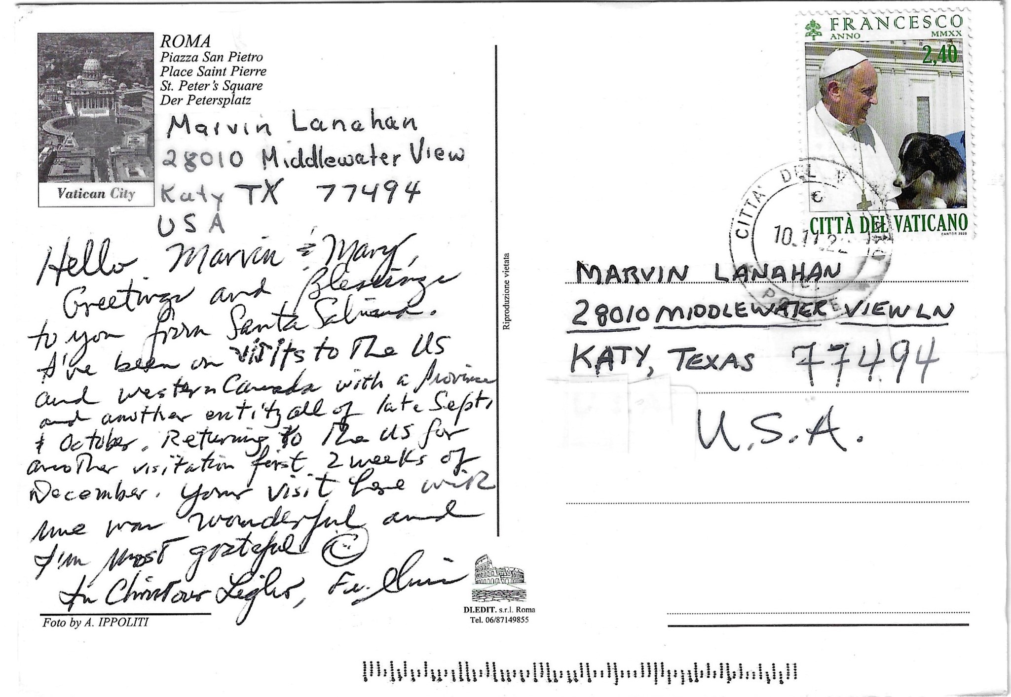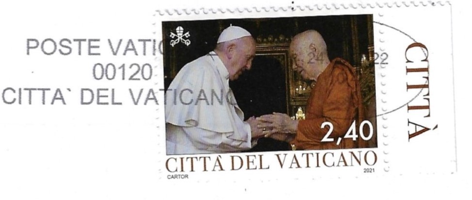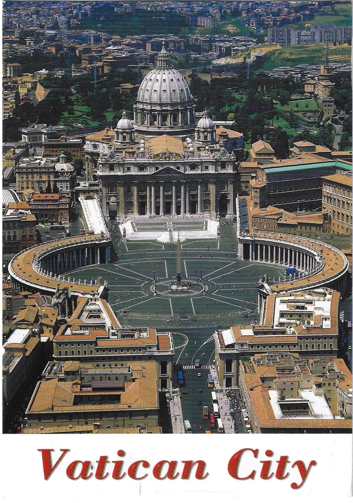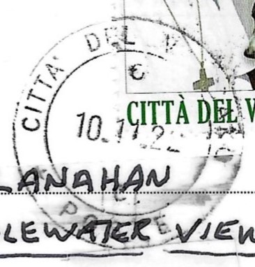 In 2022, we were able to spend several days in Rome, visiting the sites of Vatican City. One of the primary things on my to-do list was to go to the Vatican Central Post, get some pictures of the building, and mail a few postcards. I wanted to get a Central Post Office postmark and compare it with postmarks of other postcards mailed at other Vatican City postal boxes. I was very, very disappointed when Swiss Guards prevented me from walking anywhere close to the Central Post Office building. (See details of this confrontation detailed in the articles referenced below.) On a happier note, one of the other things on our to-do list was to visit one of our American priest friends who works in Rome. We had a wonderful visit with our friend! When I told him of my disappointment in not being able to get a Central Post Office postmark, he said that he could probably get to the Central Post building (getting past the Swiss Guards) and mail me a postcard. True to his promise, a postcard from Vatican City arrived at my mailbox, complete with a Central Post Office postmark. I am absolutely thrilled with this addition to my Vatican stamp collection!