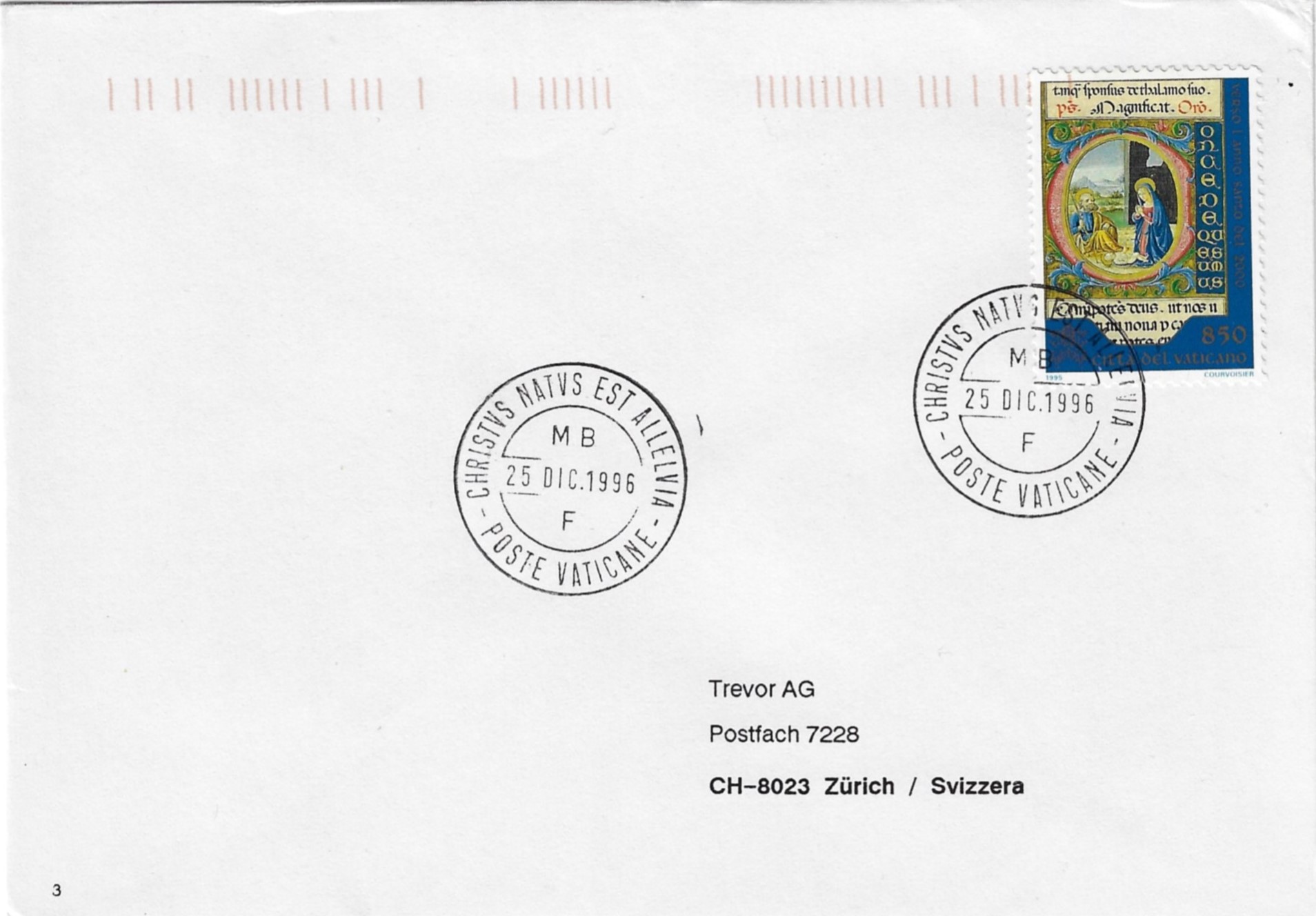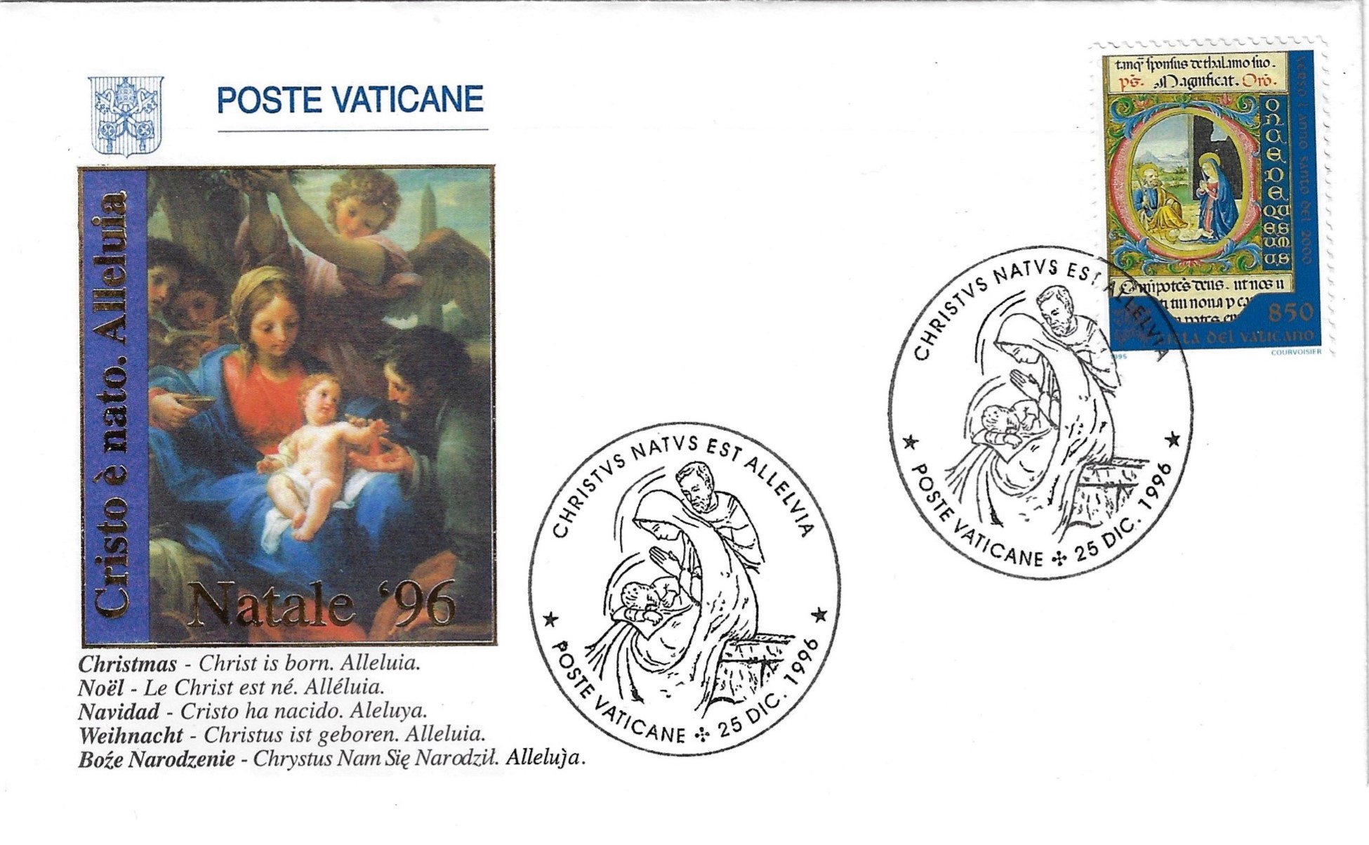 ![]() Two different Vatican Christmas Day (12/25/1996) postmarks. Same 1995 Christmas stamp, Towards Holy Year 2000 - The Nativity. (Scott 997) Addressed to same location, with different names. Any thought on why the 1995 Christmas stamps were used for 1996 Christmas postmarks? ![]() Here is a third cover, Same date 12/25/1996. ![]() Any more? Check your collections and let us know ... |