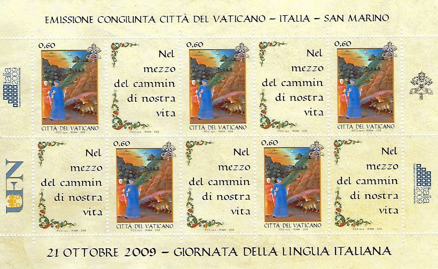 Number: 1426M Date Issued: 2009-10-21 Descriptive Name: Italian Language Day - Virgil & Dante - Mini Sheet Face value: 5 x €0,60 Color: multi Perforation: 13-1/4 x 13 Printer: Instito Poligrafico e Zecca dello Strata Italiano Click to seeUFN Bulletin Announcement