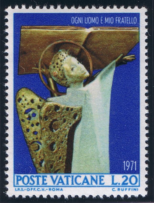 Scott Number: 501 Date Issued: 1971-02-02 Descriptive Name: World Anti-Racist Year - Crucifix & Doves Face value: 40 l Color: Dp Orange & Multi Perforation: 13.5x14 Printer: The Italian State Printing Works