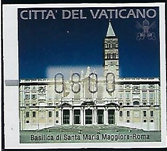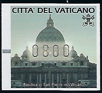 Scott Number: V1 Date Issued: 2000-03-15 Descriptive Name: Vending Machine - St. Peter's Basilica Face value: 0800 Color: Multi Perforation: Imperf Printer: Helio Courvoisier SA (Switzerland) Click to seeUFN Bulletin Announcement