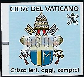 Scott Number: V5 Date Issued: 2000-03-15 Descriptive Name: Vending Machine - Coat of Arms of Pope John Paul II Face value: 0800 Color: Multi Perforation: Imperf Printer: Helio Courvoisier SA (Switzerland) Click to seeUFN Bulletin Announcement