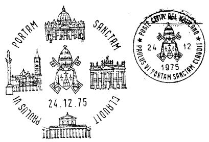 Cancellation marking the opening of the 1975 Holy Year on December 24, 1974. The coat-of-arms of Pope Paul VI appears in the center. The cancellation reads: Pope Paul VI, crossing the threshold of the Vatican Basilica, opens the Jubilee.