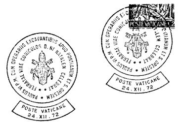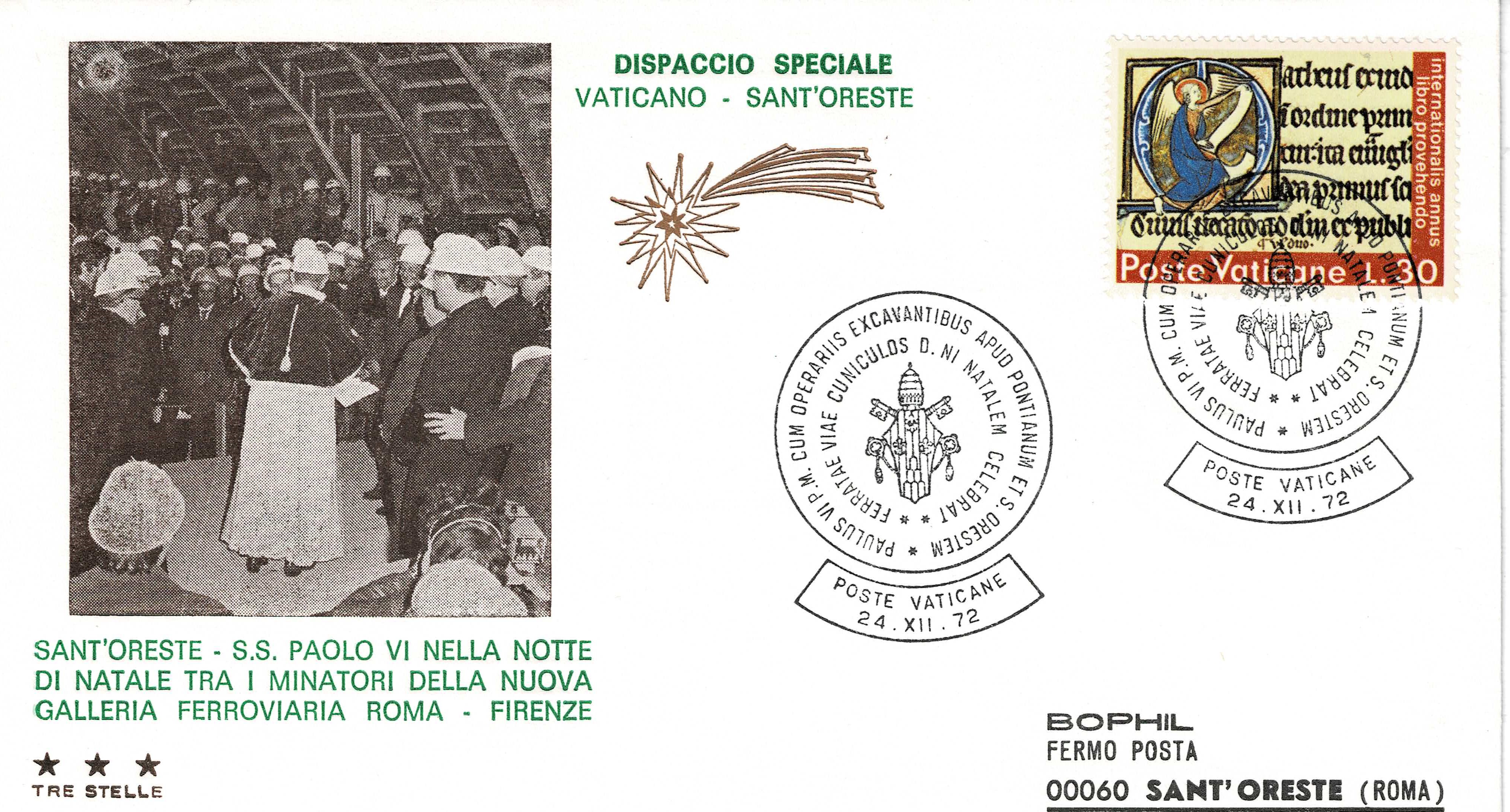 Cancellation marking Pope Paul's visit with workers on Christmas Eve, 1972. The cancellation reads: Pope Paul VI celebrates Christmas with corkmen excavating tunnels for the railroad at Pontiaum and St. Oreste.
