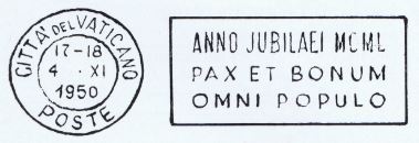 Machine cancellation marking the 1950 Holy Year. The cancellation reads Jubilee Year 1950 - Peace and Good to all the People. Period of usage was at least between the dates shown in the cancellation, December 24,1949 and December 1, 1950.