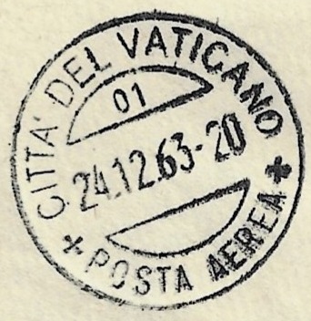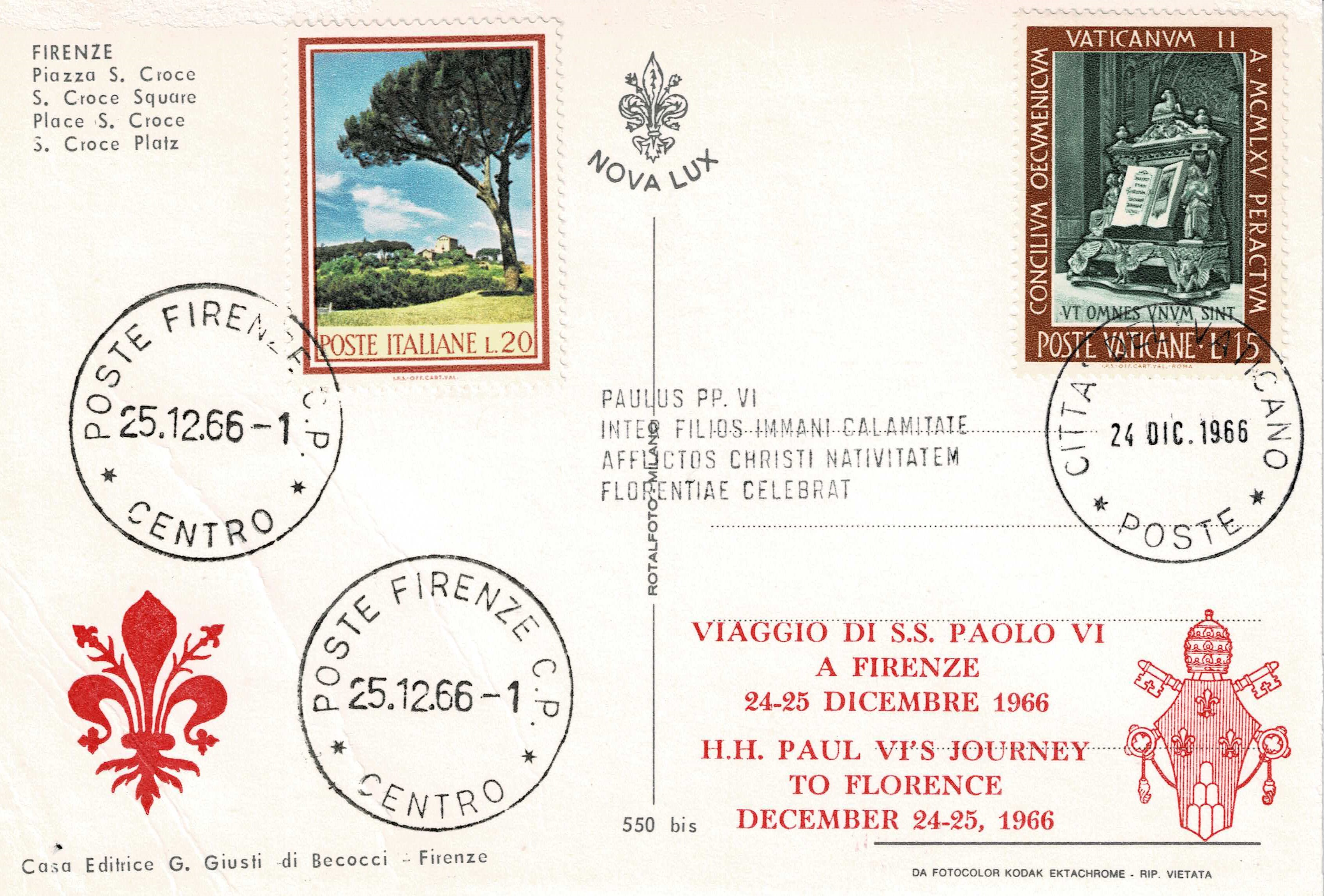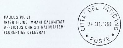 Cancellation marking Pope Paul's trip to Florence on December 24, 1966 after the disastrous floods in the area a short time earlier. The cancellation reads: Pope Paul VI celebrates the Navitity of Christ at Florence among his children afflicted by a great calamity.