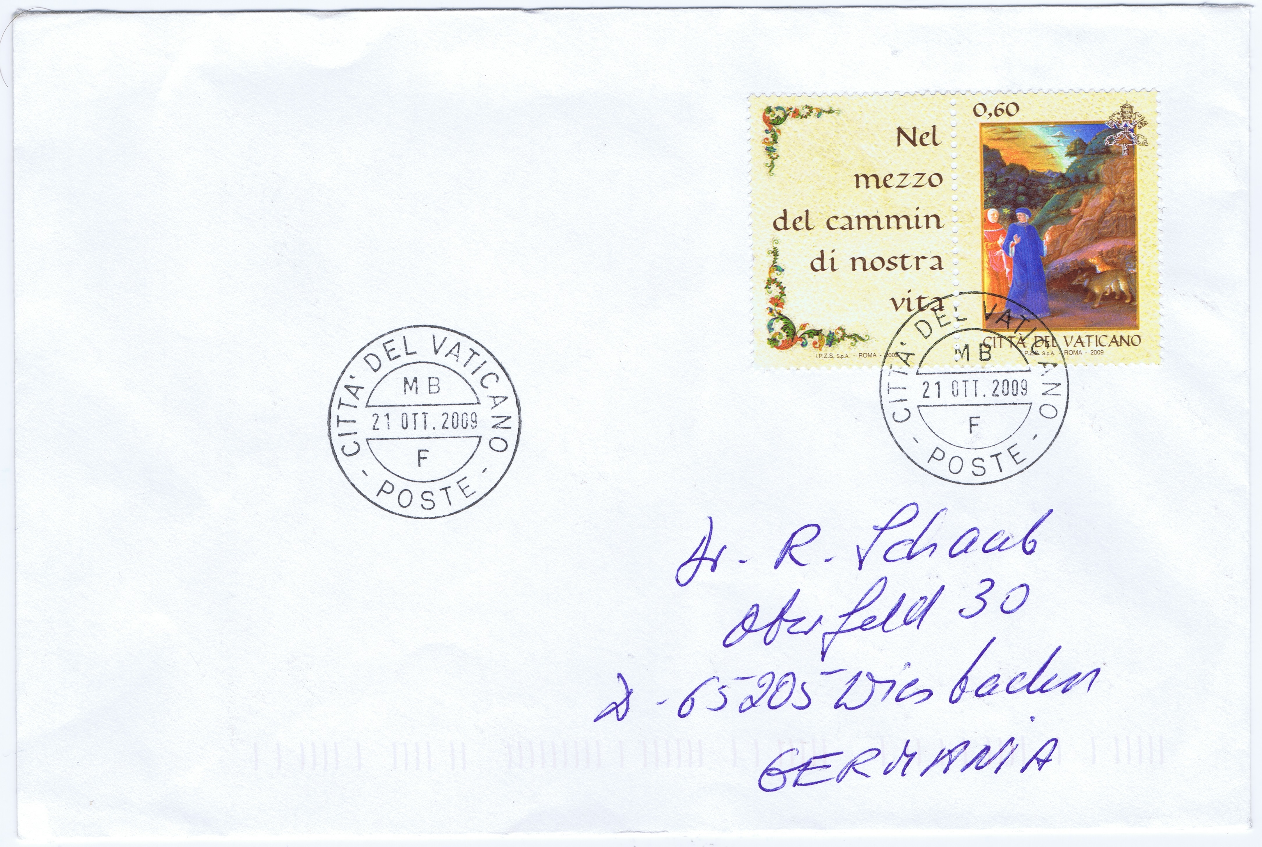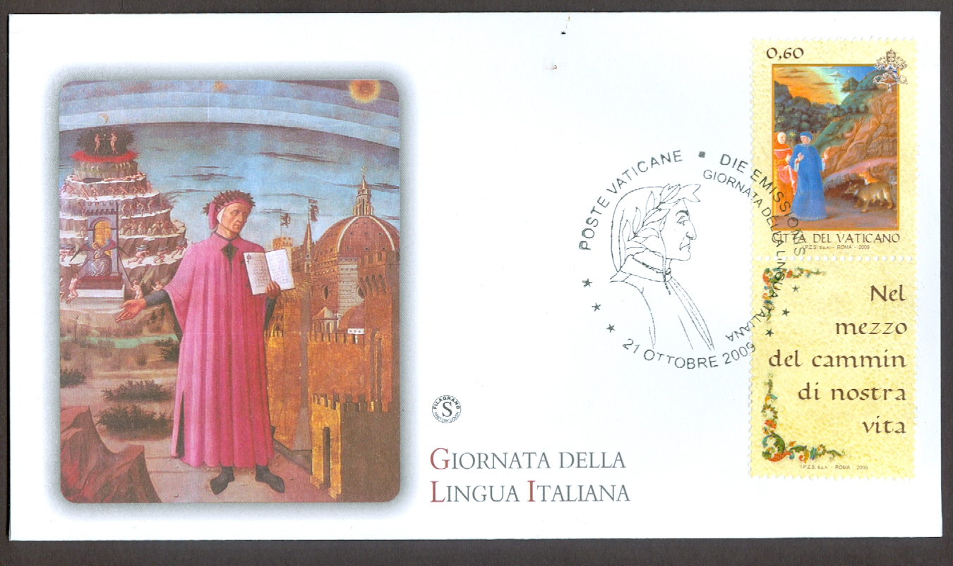 Scott Number: 1426 Date Issued: 2009-10-21 Descriptive Name: Italian Language Day - Virgil & Dante Face value: €0,60 Color: multi Perforation: 13-1/4 x 13 Printer: Instito Poligrafico e Zecca dello Strata Italiano Click to seeUFN Bulletin Announcement
